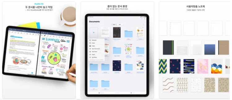 | 굿노트 | 필기감 좋음. 많은 페이지의 자료를 보더라도 빠름. 각 페이지 별로 속지 변경 가능 |