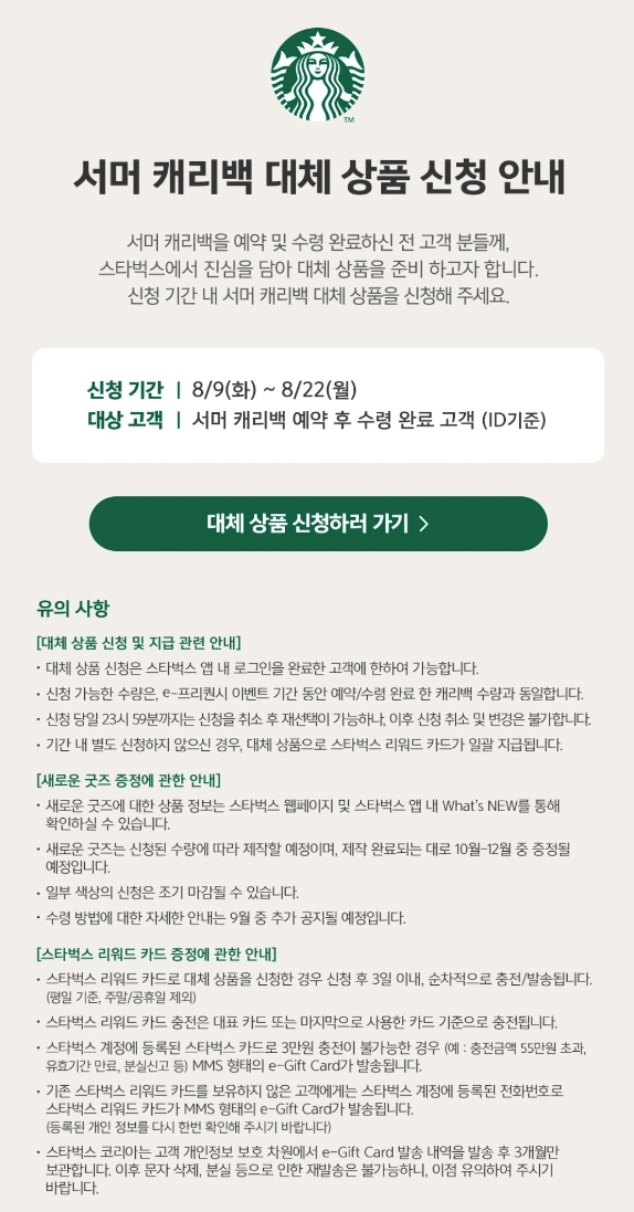 - 서머 캐리백 대체 상품 신청 기간 : 8월 9일 (화) ~ 8월 22일 (월)