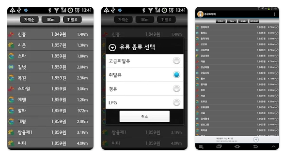 - 종류(고급휘발유, 휘발유, 경유, LPG충전소) 선택 가능